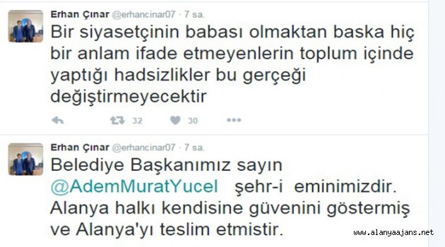 Konaklı Mahallesinde bir otelde Konaklı eski belediye başkanı Ali Şahin'in ev sahipliğinde dün gerçekleştirilen belediye başkanları toplantısında, Adem Murat Yücel'in belediyenin faaliyetlerini anlattığı sırada Türkler eski Belediye Başkanı ve Dışişleri Bakanı Mevlüt Çavuşoğlu'nun babası Osman Çavuşoğlu'nun " İcraatlarını bize değil seçmenlere anlat" diyerek susturmasına sosyal medya üzerinden tepkiler büyüyor. ER: ADEM BAŞKAN SİZİN EMİR ERİNİZ DEĞİLMHP İlçe Başkanı Hilmi Er, "Toplantıda maalesef hepimizi derinden üzen bir olay meydana gelmiştir. Büyük Alanya'nın görevi başındaki tek Belediye Başkanı olan Adem Murat Yücel, konuşma yaptığı sırada Türkler eski Belediye Başkanı Sn. Osman Çavuşoğlu sözlü olarak müdahale etmiş ve Belediye Başkanımızın konuşmasına engel olmuştur. Alanya siyaseti, siyaset kulvarları ve görüşleri farklı olsada ortak paydalarda rahatlıkla buluşabilen, siyasi nezaketi içselleştirmiş ve belli bir olgunluk düzeyine sahiptir. Yapılacak olan bu tarz olumsuz davranışların Alanya ya ve Alanya siyasetine katkısı olmayacağı gibi var olan bu güzel seviyeyi en alt noktalar çekecektir. Alanya Belediye Başkanı sizin emireriniz, çalışanınız veya iktidarın ataması ile o makama getirilmiş olan bir memurunuz değildir. Belediye Başkanımız Adem Murat Yücel yetkisini kanunlardan ,gücünü de direkt olarak Alanya halkından almaktadır . İcraatlarını beğenmeyebilirsiniz , eksik bulabilirsiniz , hatta belediye başkanını sevmeyebilirsiniz. Ancak Alanya halkının büyük desteğiyle seçilmiş olan Adem Murat Yücel'e saygı duymak zorundasınız" dedi.ÇINAR: ÖZÜR BEKLİYORUZAynı olayla ilgili Ülkü Ocakları Başkanı Erhan Çınar ise Twitter hesabından, "Belediye Başkanımız Sayın Adem Murat Yücel şehr-i eminimizdir. Alanya halkı kendisine güvenini göstermiş ve Alanya'yı teslim etmiştir. Bir siyasetçinin babası olmaktan başka hiç bir anlam ifade etmeyenlerin toplum içinde yaptığı hadsizlikler bu gerçeği değiştirmeyecektir. Sayın başkanımız da kendisine 'aklın yaşta değil başta olduğunu' saygıdeğer tutumu ile göstermiştir. Bu saygısızlığı öncelikle kendi oğluna ve şehri Adem Murat Yücel başkanımıza teslim eden Alanya halkına karşı yapılmış kabul ediyor; en kısa sürede kendisinden özür bekliyoruz" dedi. YILDIRIM: YAŞLILIĞINA BAĞLIYORUZBüyük Birlik Partisi İlçe Başkanı Fevzi Yıldırım ise, "Seçilmiş Alanya Belediye Başkanı Adem Murat Yücel'e karşı yapılan sözünü kesme ve aşağılama, kabul edilir değildir. Biz Osman Çavuşoğlu'na saygı duyuyoruz. İki oğlu da Alanya'nın onuru ve gururudur. Lakin Osman Çavuşoğlu'nun yaptığı çıkış kabul edilebilir değildir. Bırakın Adem Murat Yücel'i çalışsın. Bu tip hareketler ne kadar doğrudur acaba? Sizin çalışan bir belediye başkanını motive etmeniz gerekirken aşağılamaktan başka işiniz yok mu? Osman Çavuşoğlu'nun yaptığı davranışı yaşlılığına bağlıyor ve Başkan Yücel'in susmasını da gösterdiği bir saygı olarak değerlendiriyoruz. Osman Çavuşoğlu'na da tavsiyemiz, Dışişleri Bakanı'nın babası olarak herkese gönlünü ve yüreğini açmasıdır" şeklinde yorumladı.UYGUR: BİZDE SİZE SAYGI DUYMUYORUZAlper Ocakları Başkanı Vedat Uygur ise, "Alanya'da seçimle, halkın sevgisini kazanarak iş başına gelmiş, halkımızın görev ve yetki verip mührü emanet ettiği belediye başkanına,bu gün bakanın babası niteliğinden başka hiç bir siyasi kimliği olmayanlarda saygı duymasını bilecek. Halkımızın seçtiğine saygı duymayıp, büyük şehir yasası ile koordinatörlük adı altında atanmış eş belediye başkanı atayanlar halkımızın namzet gönlünde asla yer bulamayacaktır.. Halkımızın tercihine ve iradesine saygı duymayanlar, bizde size saygı duymuyoruz" açıklamasında bulundu. Siyasetle uzaktan yada yakından ilgili bir çok isimde yine sosyal medya hesaplarından yaşananları eleştirip büyük çoğunluğu başkan Adem murat Yücel'e destek verdi.