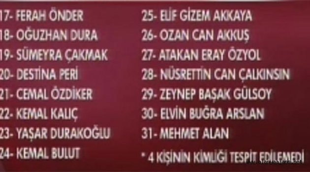 Ankara dün bir kez daha acının başkenti oldu. Terör bu kez durakta bekleyen sivilleri vurdu. Güvenpark otobüs duraklarının olduğu bölgede meydana gelen patlamada 37 kişi hayatını kaybetti. Hayatını kaybedenlerden 6 kişi hariç, 31 kişinin kimliği tespit edildi.İŞTE SALDIRIDA HAYATINI KAYBEDENLERİN KİMLİKLERİBağdat Çermik, Muharrem Çermik, Ayşe Bilgilioğlu, Perihan Çermik, Mehmet Yurtseven, Turgay Bulut, Fehmi Çetinkaya, Murat Gül, Hamide Sibel Çetinkaya, Berkay Baş, Erdem Soydan, Taner Kılıç, Feyza Acısu, Nevzat Alagöz, Sevinç Gökay, Kerim Sağlam, Ferah Önder, Oğuzhan Dura, Sümeyra Çakmak, Destina Peri, Cemal Özdiker, Kemal Kalıç, Yaşar Durakoğlu, Kemal Bulut, Elif Gizem Akkaya, Ozan Can Akkuş, Atakan Eray Özyol, Nüsrettin Can Çalkınsın, Zeynep Başak Gürsoy, Elvin buğra Arslan, Mehmet Alan24 CENAZE AİLELER TARAFINDAN ALINDIÖte yandan Adli Tıp Kurumu'na getirilen 34 cenazeden 24'ü yakınları tarafından alınırken, 3 kişinin kimlik tespit çalışması devam ediyor. 7 cenazenin ise, otopsi işlemleri devam ediyor.Sabah saatlerinde Adli Tıp Kurumu'na gelen aileler çıkışta ayakta durmakta güçlük çekti