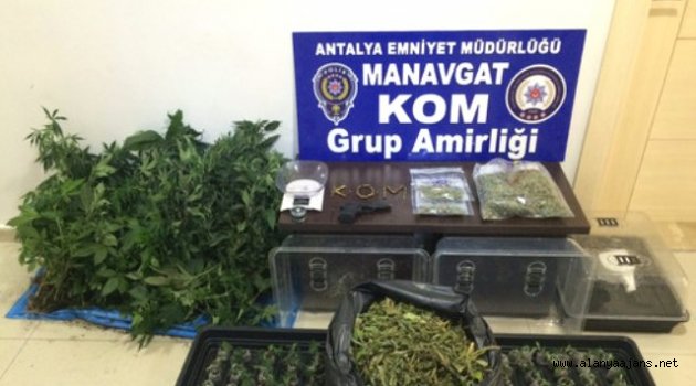 Ekiplerin yaptığı operasyonda, ev içinde bir odada yapay sera oluşturularak 21 hint keneviri, 3 adet fide yetiştirme fanusu, 71 adet hint keneviri fidanı, 4 kilo 603 gram esrar, 1 adet hassas terazi, 7.65 çapında tabanca, tabancaya ait 27 mermi ile uyuşturucu madde yapımında kullanın çok sayıda aparat ele geçirdi. Ekipler, evde hint keneviri yetiştiren ve esrar yapan E.C.'yi gözaltına aldı. E.C., Manavgat İlçe Emniyet Müdürlüğü'nde yapılan işlemlerin ardından adliyeye sevk edildi. Zanlı E.Ç., çıkarıldığı mahkemece tutuklanarak Alanya Cezaevi'ne teslim edildi