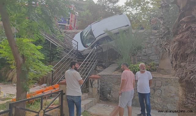 Alanya'da öğle sıralarında meyanda gelen olayda araç sürücüsü Şerif B. Damlataş Güzelyalı Caddesi'nden Kale Yolu'na giriş yaptı. Bu sırada araçta bulunan eşyaların devrilmesi üzerine eşyaları düzeltmek için hamle yapan sürücü direksiyon hakimiyetini kaybetti. Önce yolun sağ tarafındaki duvara çarpan araç ardından sol tarafta bulunan istinat duvarından aşağı düştü. Duvarda bulunan demir merdivenlere takılan araç demirlerin üzerinde asılı kaldı. Olay yerine gelen itfaiye ekipleri sürücüyü araçtan çıkardı. Şok halinde olduğu gözlenen sürücü olay anını kendini kurtaran itfaiye ekiplerine anlattı. Aracın, yüksekliği 5 metre olan duvardan düşerken merdivenlere takılması şans eseri can kaybının yaşanmasının önüne geçti. Çocuk parkında bulunan merdivenlerde veya civarında başka bir vatandaşın olmaması da sevindirici bie diğer nokta oldu. Polis ekipleri konuyla ilgili tahkikat başlattı.