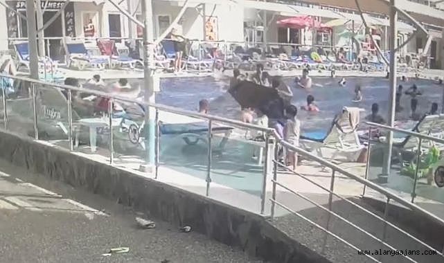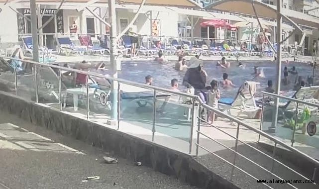Alanya’da havuz başında şezlongda otururken üzerine baca kapağı düşen 37 yaşındaki kadın ağır yaralandı. O anlar güvenlik kamerasında kaydedildi.