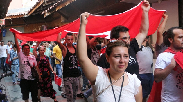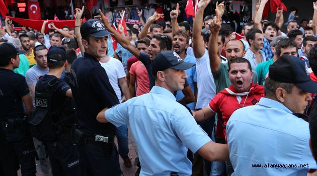 Terörü lanet mitingiyle başlayan yürüyüş olaylı sürdü. Son günlerde yaşanan terör olaylarını kınamak isteyen bir grup, Alanya HDP binasına Türk bayrağı astı. Olaya tepki gösteren HDP'lilerin polise saldırmasının ardından, grup ile HDP'liler arasında taşlı sopalı kavga çıktı. Olaylarda Kaymakam Hasan Tanrıseven'de TOMA'nın sıktığı suya maruz kalınca TOMA aracının su sıkmaması için ikaz etti.