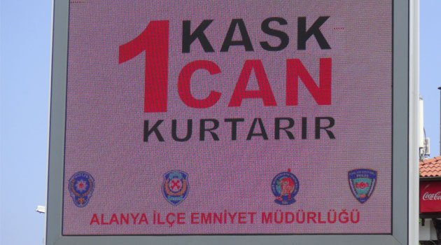 Alanya'da hızla artan motosiklet sayıları ve beraberinde sık sık sürücü hataları sonucu yaşanan kazalar ile kazaların sonrasında yaşananlara dikkat çekmek isteyen Alanya Emniyet Müdürlüğü şehrin en büyük reklam panosunda uyarıcı reklamlar yayınlamaya başladı.Alanya Emniyet Müdürlüğü Toplum Destekli Polislik Büro Amirliği tarafından sayıları her geçen artan ve ilçe dışına kayıtlı olanlarla birlikte sayıları 50 bini aşan motosikletlere dikkat çekiyor.Polis tarafından hazırlanan reklamlar Kuyularönü Cami Kavşağında bulunan dev reklam panosunda yayınlanmaya başlandı. Yayınlanan kamu spotu niteliğindeki eğitici reklamlarla sürücülerin dikkati çekilmeye çalışıyor.