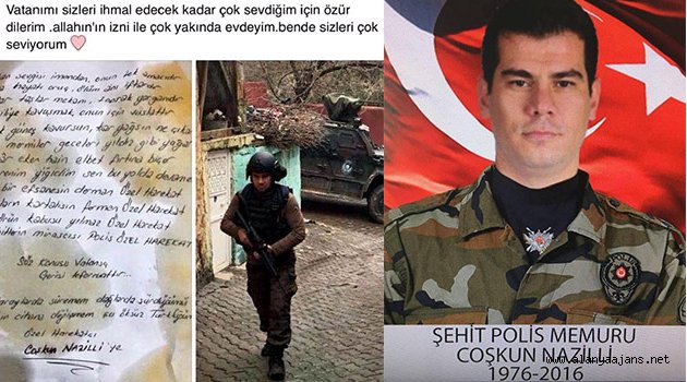Mardin Nusaybin'de şehit olan polis özel harekat memuru Coşkun Nazilli'nin çocukları tarafından gönderilen mektubu, sosyal paylaşım sitesindeki kişisel hesabından yaklaşık 1 ay önce kendi fotoğrafıyla birlikte paylaştığı ve üzerine de "Vatanımı sizleri ihmal edecek kadar çok sevdiğim için özür dilerim. Allah'ın izniyle çok yakında evdeyim. Ben de sizleri çok seviyorum" notunu koyduğu belirtildi.