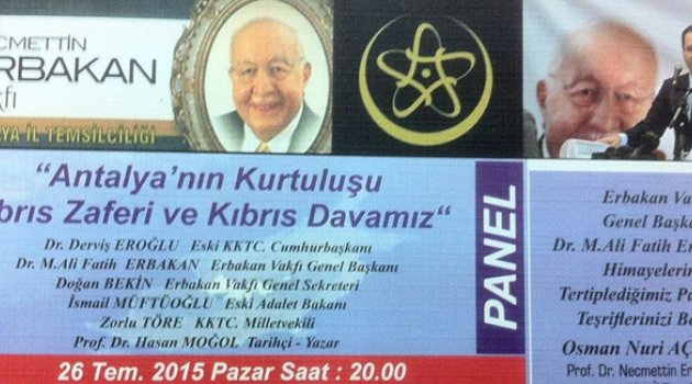 KKTC eski Cumhurbaşkanı Derviş Eroğlu ile Kıbrıs Barış harekatına onay veren isimlerden döenmin başbakan yardımcısı Necmettin Erbakan'ın oğlu FatihErbakan katılıyor.Erbakan Vakfı Alanya Temsilcisi Azizi Sarıkan, yaptığı açıklamada şu ifadelere yer verdi.